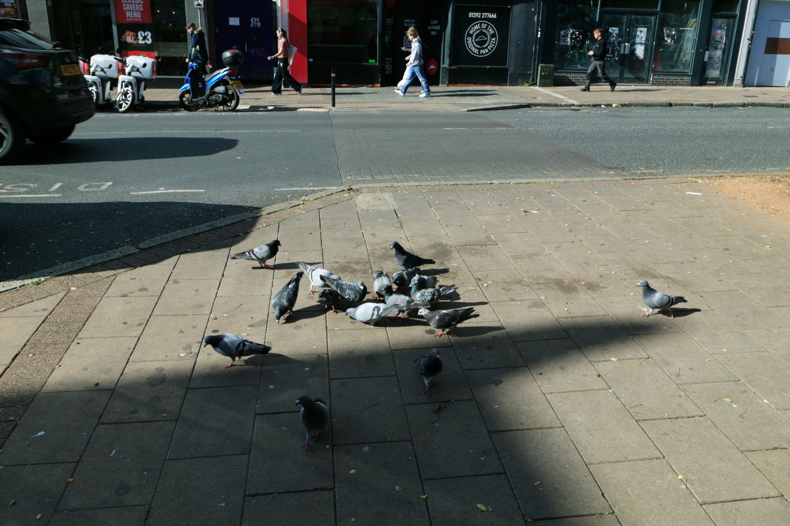 pidgons feeding in the street in exteter - this is the sidwell street area of the town that had mainly smaller shops rather than big brands